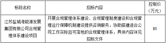 江蘇鹽城港能源發展集團有限公司合規管理體系建設項目已經相關部門批準實施, 項目所需資金來源自籌已落實。現決定對該項目進行公開招標,擇優選定承包人。
