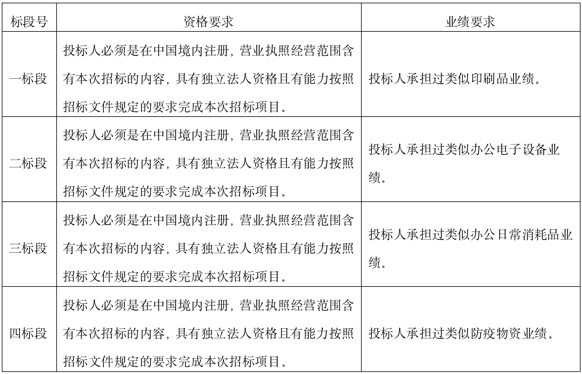 5、各標段投標人資格及業績要求見下表: