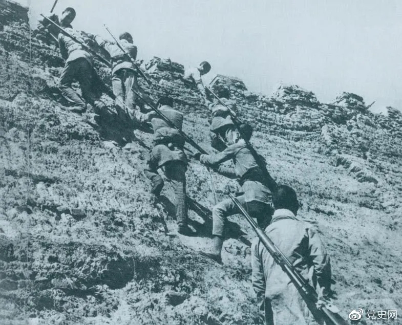 1945年6月25日,八路軍冀中部隊攻克河北獻縣。圖為部隊奮勇攀登城墻。