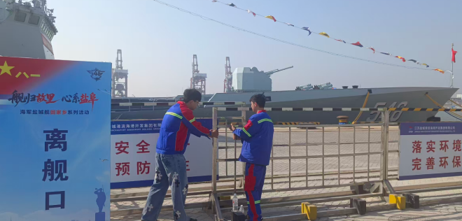 清理通航隱患,調(diào)整其他船舶作業(yè)計劃,統(tǒng)籌協(xié)調(diào)海事、交管、應(yīng)急、安保力量,開辟“鹽城艦”靠泊“綠色通道”,對接戰(zhàn)艦需求,完善水、電等配套保障設(shè)施,調(diào)配各類物資、能源、素材等資源,滿足戰(zhàn)艦駐泊期間的各項保障需求;安排專業(yè)技術(shù)人員全程值守,提供全方位技術(shù)支持,及時響應(yīng)各類服務(wù)訴求;協(xié)同提升碼頭周邊治安管控與環(huán)境治理水平,全力保障艦艇官兵充足休整,用熱忱服務(wù),讓戰(zhàn)艦官兵充分體會到民港與軍港之間的無縫協(xié)同與溫情保障,切實把擁軍愛軍的情懷融入每一項服務(wù)細(xì)節(jié),每一道協(xié)同環(huán)節(jié)。