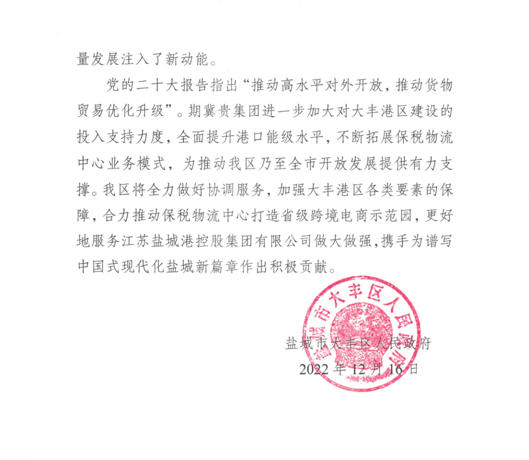 12月16日,大豐區(qū)人民政府向我集團(tuán)發(fā)來賀信,對我集團(tuán)下屬保稅物流中心經(jīng)營業(yè)績再創(chuàng)新高表示祝賀。