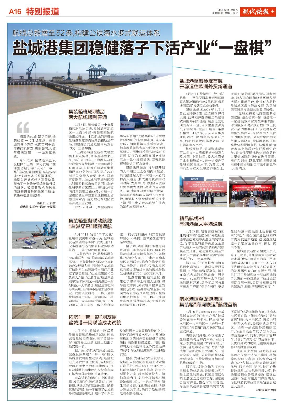 此外,2月24日,鹽城港內河集裝箱船舶“大港集002”輪滿載著56TEU的卡紙和小麥,從大豐港區內河集裝箱碼頭緩緩駛離,標志著鹽城港大豐港區至南通通海碼頭內河集裝箱精品航線正式開通,切實為鹽城港集團搶抓長三角一體化戰略機遇、完善航線布局提供了有力支撐。