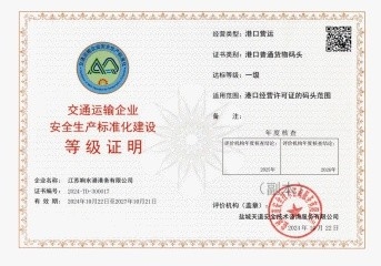 近日,鹽城港響水港區(qū)順利通過交通運(yùn)輸企業(yè)安全生產(chǎn)標(biāo)準(zhǔn)化達(dá)標(biāo)認(rèn)證考核,喜獲“交通運(yùn)輸企業(yè)安全生產(chǎn)標(biāo)準(zhǔn)化建設(shè)一級證書”。響水港區(qū)在安全生產(chǎn)管理體系精細(xì)化、規(guī)范化、標(biāo)準(zhǔn)化建設(shè)方面邁入新的發(fā)展階段,為推動港口安全生產(chǎn)工作再上新臺階奠定了堅(jiān)實(shí)基礎(chǔ)。