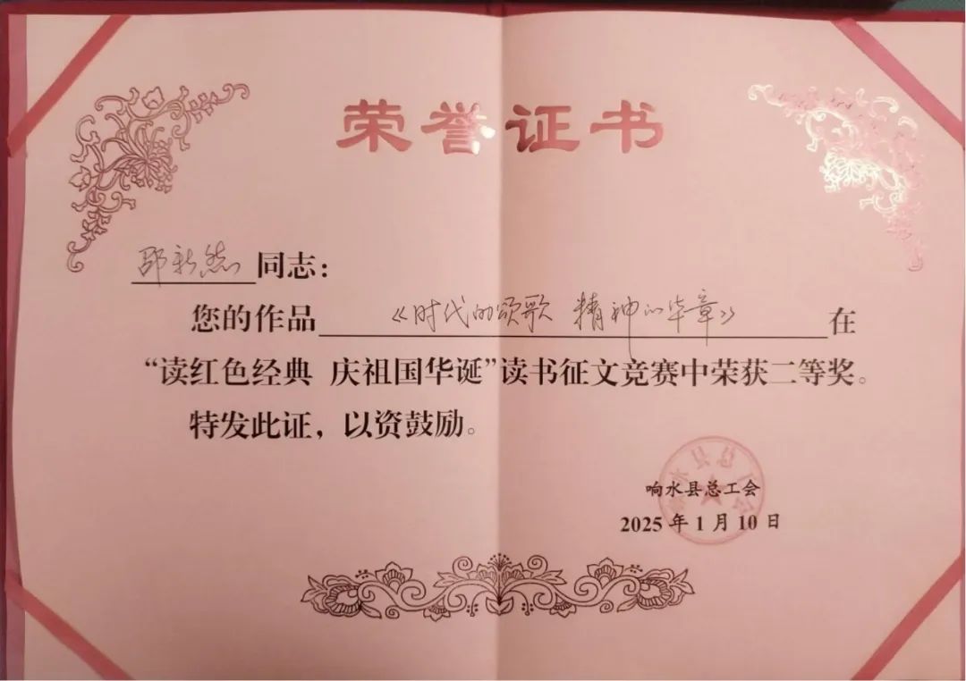 近日,由響水縣總工會(huì)舉辦的2024年度“讀紅色經(jīng)典、慶祖國(guó)華誕”職工讀書征文競(jìng)賽活動(dòng)結(jié)果相繼公布,江蘇響水港物流有限公司業(yè)務(wù)組邵新然的《時(shí)代的頌歌,精神的華章》在眾多作品中脫穎而出,榮獲征文競(jìng)賽二等獎(jiǎng)。