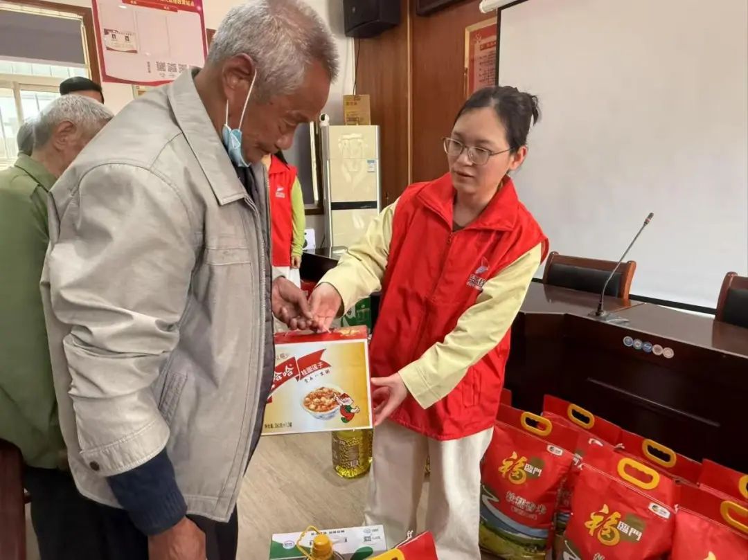 當員工們將大米、食用油、牛奶、保暖用品等生活物資逐一遞到老人手中時,現場響起了陣陣掌聲。