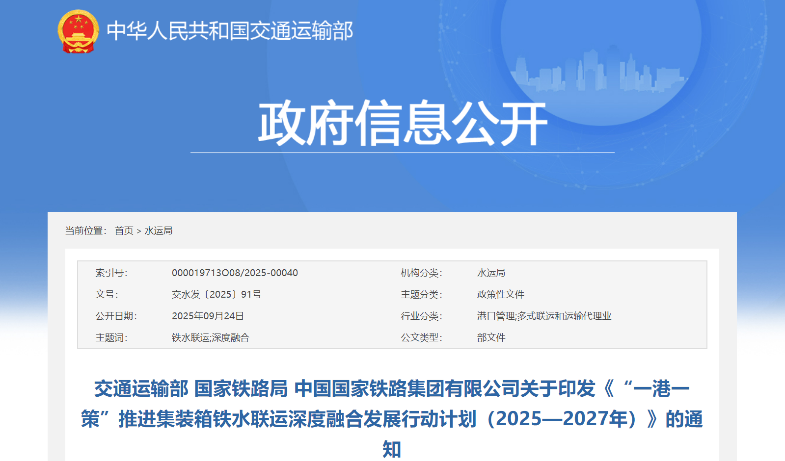 為深入貫徹落實(shí)黨中央、國(guó)務(wù)院決策部署,優(yōu)化調(diào)整運(yùn)輸結(jié)構(gòu),進(jìn)一步發(fā)揮綜合運(yùn)輸優(yōu)勢(shì),促進(jìn)有效降低全社會(huì)物流成本,現(xiàn)將《“一港一策”推進(jìn)集裝箱鐵水聯(lián)運(yùn)深度融合發(fā)展行動(dòng)計(jì)劃(2025—2027年)》印發(fā)給你們,請(qǐng)認(rèn)真抓好落實(shí)。
