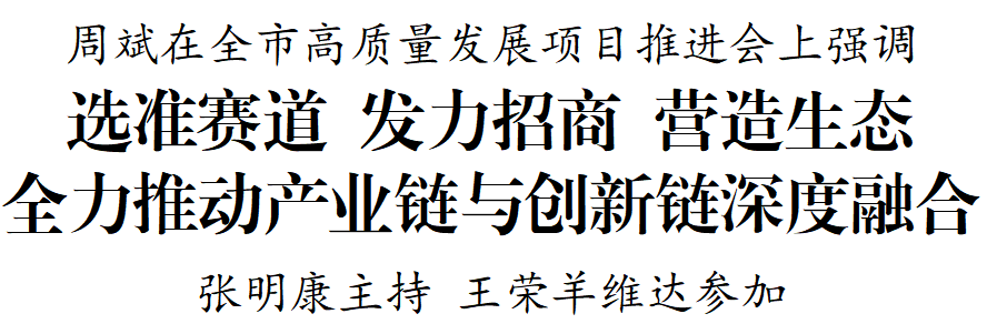 5月24日至25日,全市高質(zhì)量發(fā)展項(xiàng)目推進(jìn)會(huì)召開。市委書記周斌出席并講話。他強(qiáng)調(diào),要深入學(xué)習(xí)貫徹習(xí)近平新時(shí)代中國(guó)特色社會(huì)主義思想,全面落實(shí)“四個(gè)走在前”重大任務(wù),加快推動(dòng)產(chǎn)業(yè)鏈與創(chuàng)新鏈深度融合,以科技創(chuàng)新支撐引領(lǐng)經(jīng)濟(jì)高質(zhì)量發(fā)展,努力推動(dòng)經(jīng)濟(jì)運(yùn)行率先整體好轉(zhuǎn),為競(jìng)逐新賽道、勇當(dāng)排頭兵注入強(qiáng)大動(dòng)能。市委副書記、代市長(zhǎng)張明康主持會(huì)議,市人大常委會(huì)主任王榮,市委副書記、統(tǒng)戰(zhàn)部部長(zhǎng)羊維達(dá)參加。