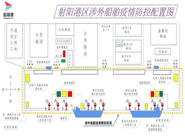 練內功,行穩筑基“守”規范。港區全面貫徹落實水路口岸疫情防控管理規定,嚴格按照涉外碼頭防控標準,扎實推動碼頭設備設施改造升級。港區根據水路口岸防控組審定的“射陽港區涉外船舶疫情防控配置圖”,改造完成了碼頭“三區兩通道”、“登輪人員梯口值守崗亭”、“界面管理崗亭”等硬件設施,擴展提升了自有監控覆蓋范圍,為射陽港區口岸對外開放后的涉外船舶“三位一體”管理工作打下堅實基礎。