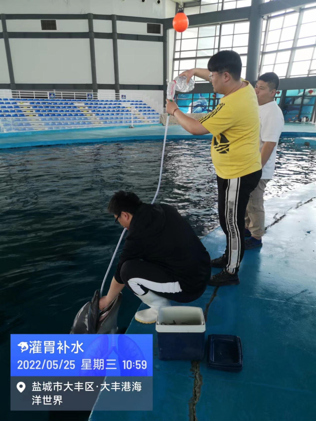 文旅集團海洋世界所飼養的兩頭海豚,學名日本寬吻瓶鼻海豚,他們來大豐港區已經生活了六年多,已充分適應了這里的環境。在我們馴養團隊的精心照料下,快樂地成長。馴養師每天精心準備海豚寶寶喜愛吃的俄羅斯進口的鯡魚、日本進口的多春魚以及挪威進口的魷魚,一個海豚的日食量達到10公斤。同時每日為其補充各種維生素。我們每天檢測他們的體溫、用插胃管的方式“飲水”。正常情況下,每月為其全面體檢一次,包括采血檢驗、胃鏡檢查、呼吸空氣采樣送檢,從而確認他們身體處于健康狀態。
