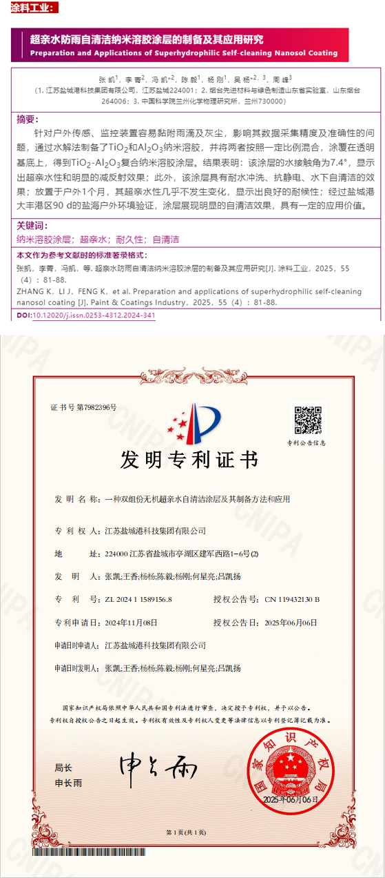 課題研究內容為針對雨天作業過程中對司機及感知傳感器的影響,從超親水防雨涂層材料方面出發,開發一種高性能、長期效港口感知傳感器鏡頭表面的超親水防雨涂層材料,為港口運行提供安全保障。依托該課題,科技集團取得《一種雙組份無機超親水自清潔涂層及其制備方法和應用》發明專利1項,在核心期刊《涂料工業》發表《超親水防雨自清潔納米溶膠涂層的制備及其應用研究》論文1篇。